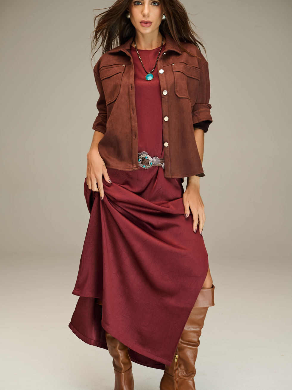 A Jaqueta De Suede Cacau é um verdadeiro coringa sofisticado: seu toque macio e acabamento aveludado transmitem aconchego com elegância. O corte reto e os bolsos utilitários equilibram o charme rústico com uma estética urbana refinada. O tom cacau aquece a composição com sobriedade, tornando-se neutro o suficiente para infinitas combinações.